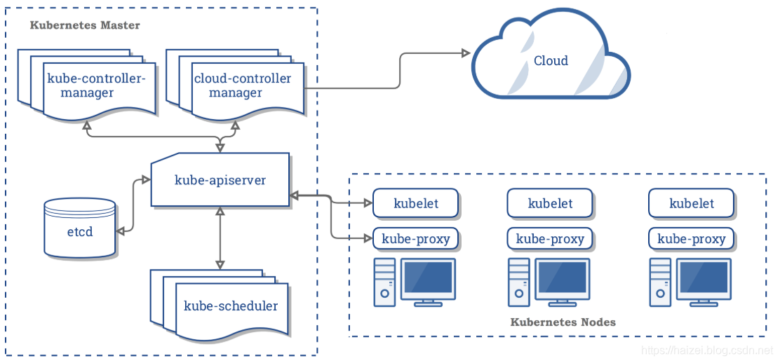 参考文档:官网文档 中文文档1 核心组件k8s集群示意图master节点1.1 etcd(数据库)作为apiServer的数据库,保存了整个集群所有资源的状态1.2kube-apiserver(暴露k8s资源api的服务)apiServer实现了k8s的所有资源(Node/Pod/RC/Service等)的restful接口,可以通过 http请求或者kubect...