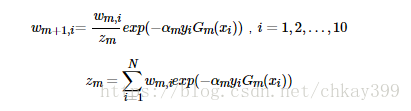 —》更新训练数据集的权值分布(这里,zm是归一化因子,使样本的概率分布和为1):