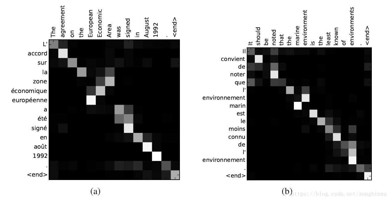 下图即文献给出的法译英任务的Attention概率图,这是两个句子,横轴表示英语,纵轴表示法语,矩阵上的像素值表示概率 a a a(或称重要性、权重、对齐概率等等),颜色越亮表示概率越大。可以明显地看出,由于英语和法语的语法结构不一样,注意力是有所偏移的。