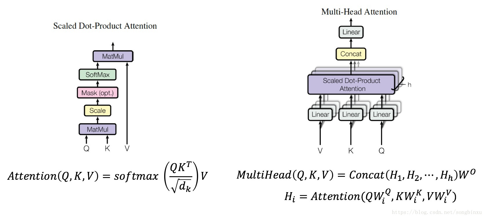 所谓多抽头Attention,实际上是由多个普通的Attention拼起来的。基本的Attention形式即 Scaled Dot-Product,类似于余弦相似度,作者认为将输入的Q、K和V分别进行多次( h h h次)的线性变换然后拼起来能获得更好的效果,于是产生了这种新颖的Attention结构。Attention可变的地方还很多,预计今后(可能已经)还会出现更多灵活的Attention变体。