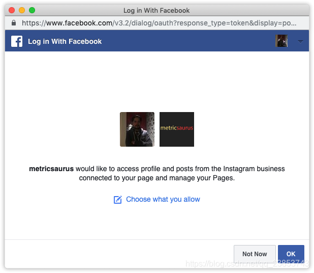 Once you have triggered the modal, click OK to grant your app the instagram_basic and pages_show_listpermissions.