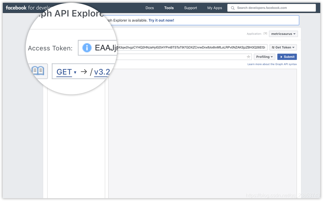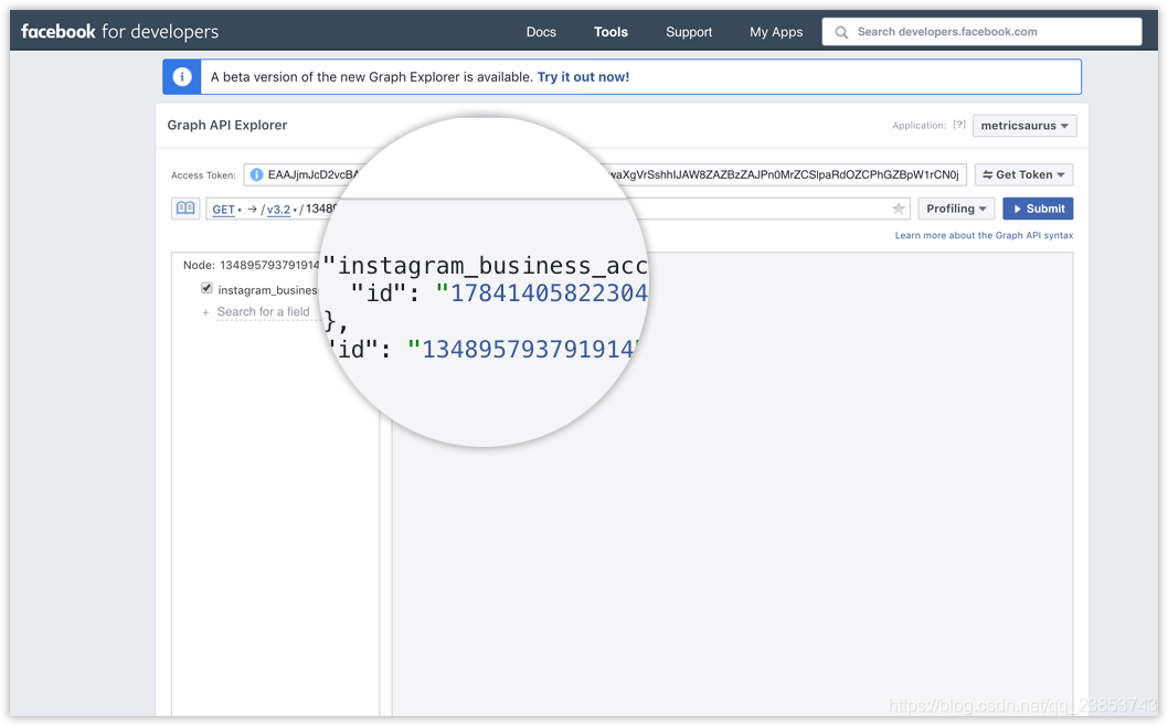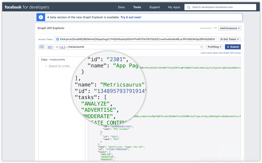 API应该返回用户访问令牌。捕获令牌,以便您的应用可以在接下来的几个查询中使用它。如果您使用的是Graph API Explorer,它将被自动捕获并显示在“ 访问令牌”字段中,以供参考: