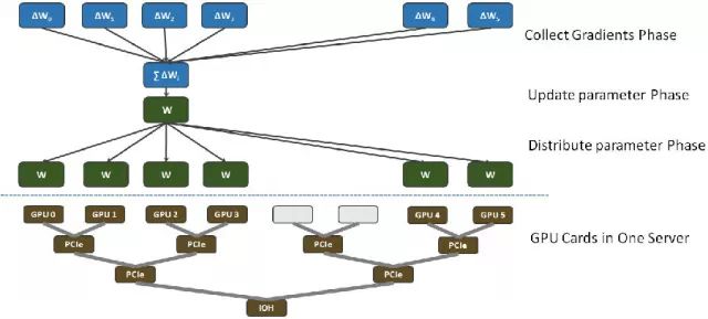 DNN的数据并行框架通过同步随机梯度下降进行训练。数据并行训练中,每个GPU卡各自训练,并各自产生一份梯度值,然后进行参数交换。图2. 展示了参数交换过程。每台GPU服务器配置6块GPU卡,其中四块通过树状的PCIe连接,并与另外两块GPU卡通过IOH连接。参数交换过程从逻辑上看,梯度收集阶段将全部梯度值累加起来,然后应用到当前模型以更新参数得到新模型,最后在模型分发阶段将新模型下发给全部GPU卡。采用数据并行后,相对于单卡训练过程,关键的问题是参数交换过程引入额外时间消耗,拖累了并行性能,使得加速比很难提高。我们通过一个精心设计的拓扑完成参数交换,提升整体性能。此外,我们采用近似的自适应学习率算法,使得支持自适应学习率所需交换的数据量降低了一个数量级。