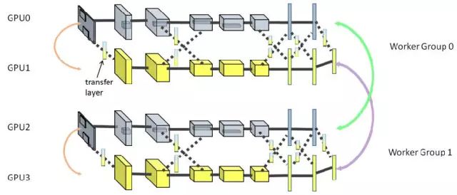 CNN模型并行和数据并行框架对GPU卡分组,组内两个GPU卡做模型并行,组间做数据并行。如上图所示,4个GPU卡分成Worker Group 0和1。组内两卡各持有CNN模型的一部分,称为partition,协作完成单个模型的训练。模型并行中,卡间数据传输通过引入Transfer Layer透明的完成。组间数据并行按同步随机梯度下降进行训练,并采用精巧的拓扑完成参数交换,但注意只有各组内属于同一个partition的数据各自交换,即图中GPU0和GPU2、GPU1和GPU3分别进行参数交换。引入数据并行和模型并行后,从磁盘读取训练数据,训练数据预处理,CNN训练分别占用磁盘、CPU、GPU资源,且均耗时较大。因此,我们引入流水线,使得磁盘、CPU、GPU资源可以同时得到利用,提升整体性能。