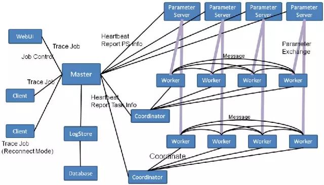 DNN CPU集群框架提供Vertex+Message的API,实现BulkSynchronous Parallel(BSP)模式。每次DNN训练作业作为一个DNN Job,其执行包含多个迭代,用户通过Client工具提交DNN Job。DNN Master负责任务调度,将训练数据分发到不同的Worker Group进行训练,并完成任务的failover等,以支持数据并行。Master将DNN Job的状态变化通过LogStore系统同步到数据库,便于从WebUI展示全部作业状态。此外,Master负责Counter的收集,并在WebUI上可视化展示。每个Worker Group中有1个Coordinator协调全部Worker完成模型并行,而Worker完成具体训练任务。模型通过参数服务器Parameter Server划分,并可靠存储在分布式文件系统中。在微信语音业务中,证明DNN CPU集群可取得与GPU相当的训练结果,而且CPU集群训练和GPU训练框架有互补性。