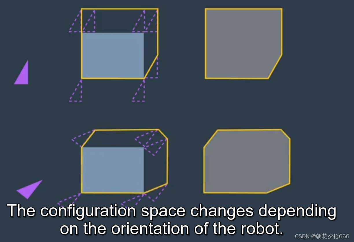 首先将机器人转换为障碍物,计算配置空间后,再转化为机器人和障碍物。