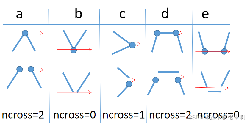理解完算法的思想之后,剩下的就是实施过程中的细节及特殊情况(点在边界上、射线经过多边形顶点、多边形某条边与射线重合。。。)的处理了。其实多边形是由多条线段首尾相连形成的闭合形状,线段是由两个不重合的点及两点之间组成的,如果我们定义,射线与**“线段”**内部和上端点相交时计数一次,那么就没有所谓的特殊情况了,如图。