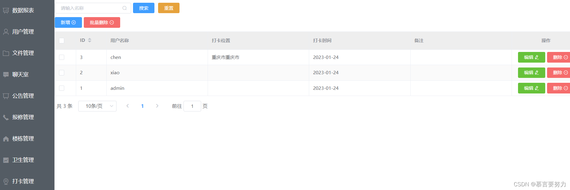百度开放平台官网:https://lbsyun.baidu.com/index.php?title=%E9%A6%96%E9%A1%B5 获取API放入到我们的前端 1.新建一个Java类2.设置我们Controller完整代码:四、前端使用接口在需要使用的vue里面使用获取当前位置的函数五、结果展示六、后台管理以上就是集成打卡的步骤,就可以进行打卡了 !!!以上就是对Springboot集成百度