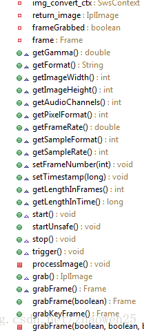 仔细看了一下,发现了一个相关的英文单词:Grabber(抓取的意思),我猜差不多就是FFmpegFrameGrabber了,开是我打开了这个类(FFmpegFrameGrabber),发现应该是猜对了,可是源码里一点有帮助的注释也没有,但是我发现了有帧相关的方法,如下所示: