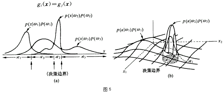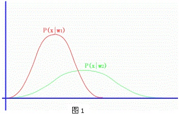 为了搞清楚一些基本概念,我们还要强调一下条件概率这个概念。我们举出两对概率,一对是P(ω1|x)和P(ω2|x),另一对是P(x|ω1)和P(x|ω1)。从表面上看,只是条件符号两边的项对换了位置,但实质上却有很大区别。前一对是在同一条件x下,比较ω1与ω2出现的概率,如果我们只考虑两类ω1和ω2,则有P(ω1|x)+P(ω2|x)=1。而对两者进行数值上的比较,如P(ω1|x)> P(ω2|x)则可以下结论,在x条件下,事件ω1出现的可能性大。