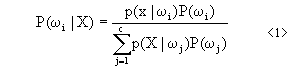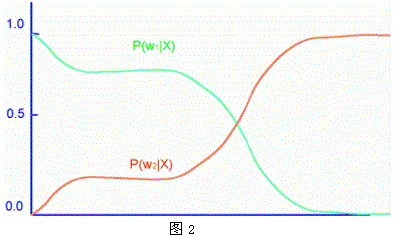 为此我们还必须利用对细胞作病理分析所观测到的信息,也就是所抽取到的d维观测向量。为简单起见,我们假定只用其一个特征进行分类,即d=1,并已知这两类的类条件概率密度函数分布已知,如图1所示,其中P(x|ω1)是正常细胞的属性分布,P(x|ω2)是异常细胞的属性分布。那末,当观测向量为X值时,它属于各类的概率又是多少呢?为此我们可以利用贝叶斯公式, 来计算这种条件概率,称之为状态的后验概率P(ωi|X)。