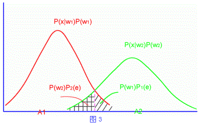 在两类别问题中,按<2>式给出的决策规则,当P(w2|x)>p(w1|x)时决策为w2。显然这个决策意味着,对观测值x有P(w1|x)概率的错误率。例如在上例中所作的w1决策,实际上包含有P(w2|x)=0.182的错误概率。在两类别的情况下,可以将p(e|x)表示成当