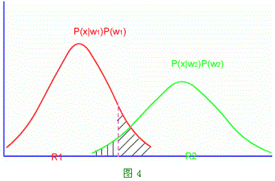 如果我们把作出w1决策的所有观测值区域称为R1,则在R1区内的每个x值,条件错误概率为p(w2|x)。另一个区R2中的x,条件错误概率为p(w1|x)。因此平均错误率P(e)可表示成