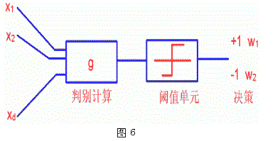 在讨论了判别函数等概念后,设计分类器的任务就清楚了。分类器可以用软件或硬件实现。图6表示了两类别问题分类器的框图,