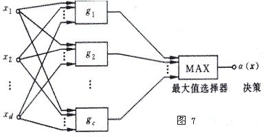 而图7则表示了多类别分类器的结构框图。两者主要的不同在于多类别情况需有一个求最大值的环节,在图7中用MAX表示,而两类情况则可简化为正负号判别器(阈值单元)。