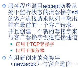 当服务器调用accept,取走客户端的连接请求之后,就会创建新的套接字。真正与客户端创建连接的,就是这个新套接字。