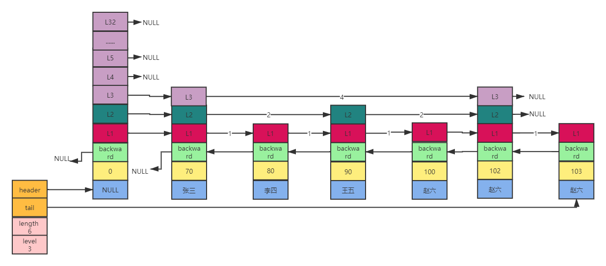 下图简单来说是对跳跃表的改进和再封装,首先引入了表头的概念,这与双向链表,字典结构一样,都是对数据的封装,因为他们都是采用的指针,而指针必然导致在计算长度,获取最后节点的数据问题上会产生查询太慢的性能问题,所以封装表头是为了在这些问题上提升速度,浪费的只是添加,删除等操作的时间,与此对比,是可以忽略的。