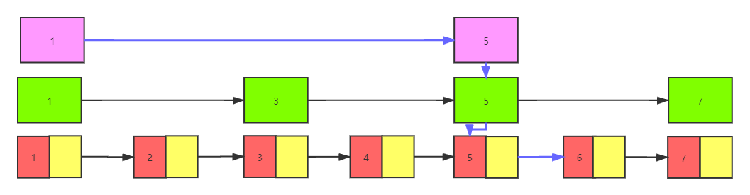 于是顺着往下找,到了二级索引,根据值为5的节点的next指针找到值为7的节点,发现比6小,说明要找到的节点6在此范围内。