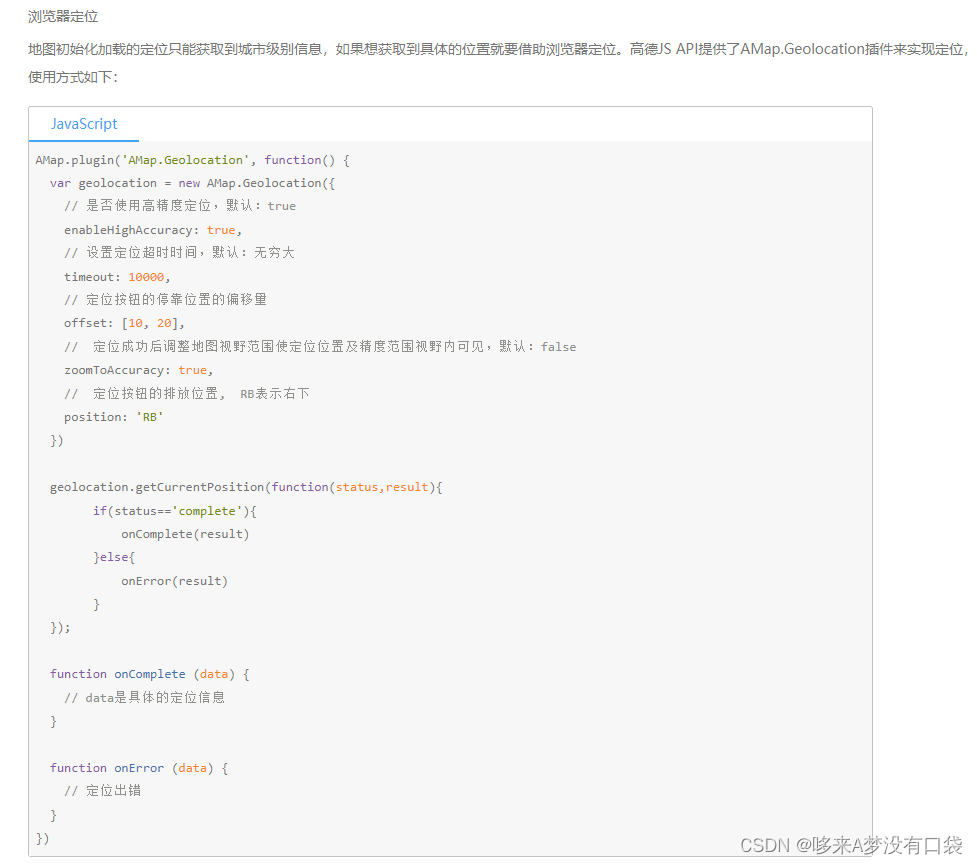 1.web js api 的定位定位-服务-教程-地图 JS API v2.0 | 高德地图API利用官网的案例进行定位 - 会报错,地图闪烁报错仅请求地址位置信息以响应用户手势,地图频繁闪烁,换一种写法AMap.plugin('AMap.Geolocation', function() {var geolocation = new AMap.Geolocation({// 是否使用高精度定位,默