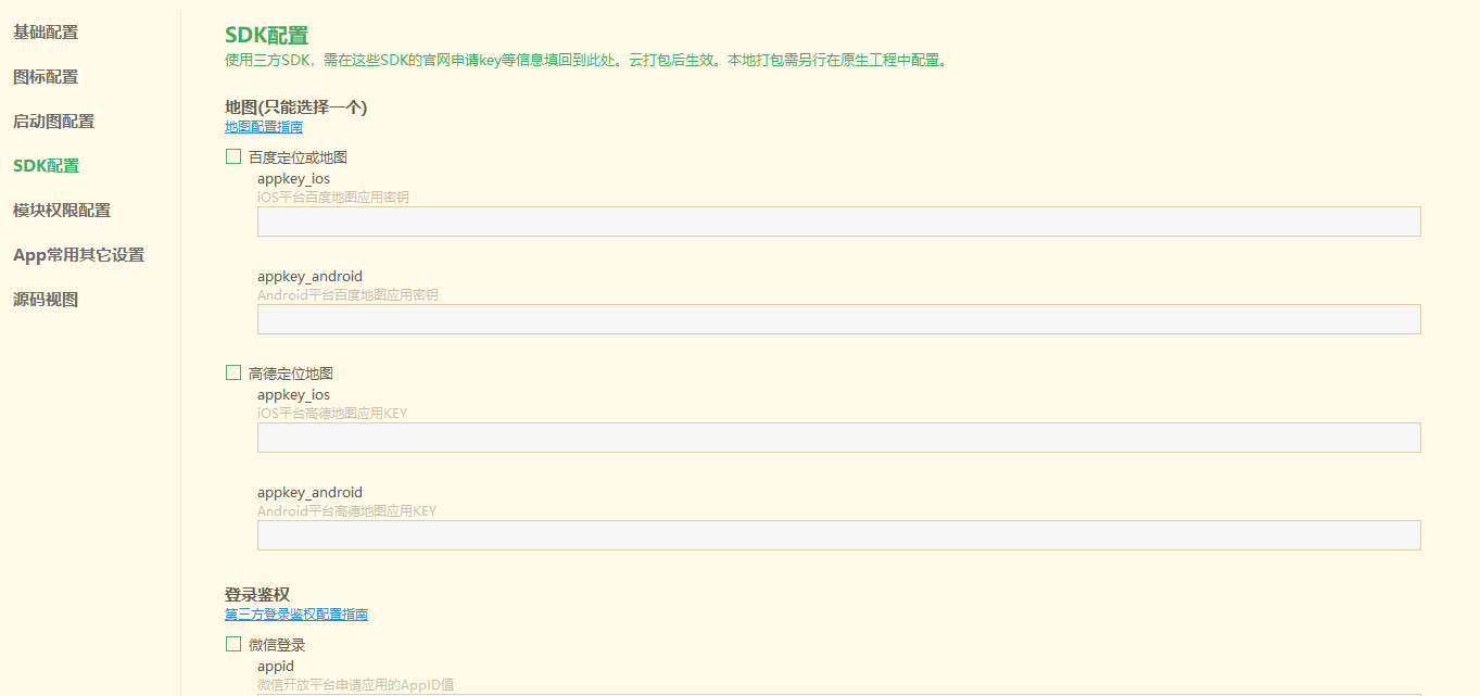 SDK 就是 Software Development Kit 的缩写,中文意思就是“软件开发工具包”,也就是辅助开发某一类软件的相关文档、范例和工具的集合都可以叫做“SDK”。HbuilderX的SDK配置可视化界面中SDK有地图、登录鉴权、支付、推送、分享、语音识别、统计7种,如图3-9所示,我们这里不对该页面进行任何设置,如果在后面的开发中有需要,我们随时可以进行设置。