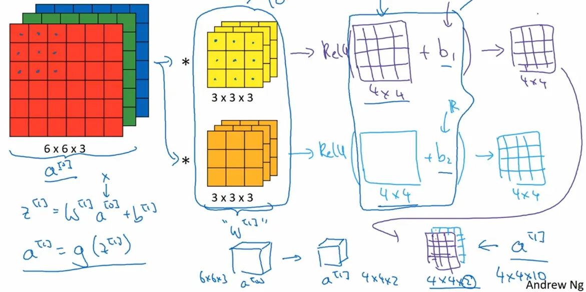 结合例子整体的讲解下一次卷积的过程。如我们有 6 * 6 * 3(3是RGB,这里称作信道) 的图片,那么我们的过滤器会是 f * f * 3,过滤器的信道数要和原来图片相同。过滤器的每个信道在原图与之对应的信道上进行过滤,这里就会生成 4 * 4 * 3 的图(图中没有画出来),生成图各个信道的图的对应位置相加,然后加上偏置项b,讲累加的结果传入激活函数,就得到了的 4 * 4 的图。不同过滤器得到的图作为某个信道的图堆积成最后的结果,也就是说 有 n 个过滤器,那么过滤得到的图就有 n 个信道。
