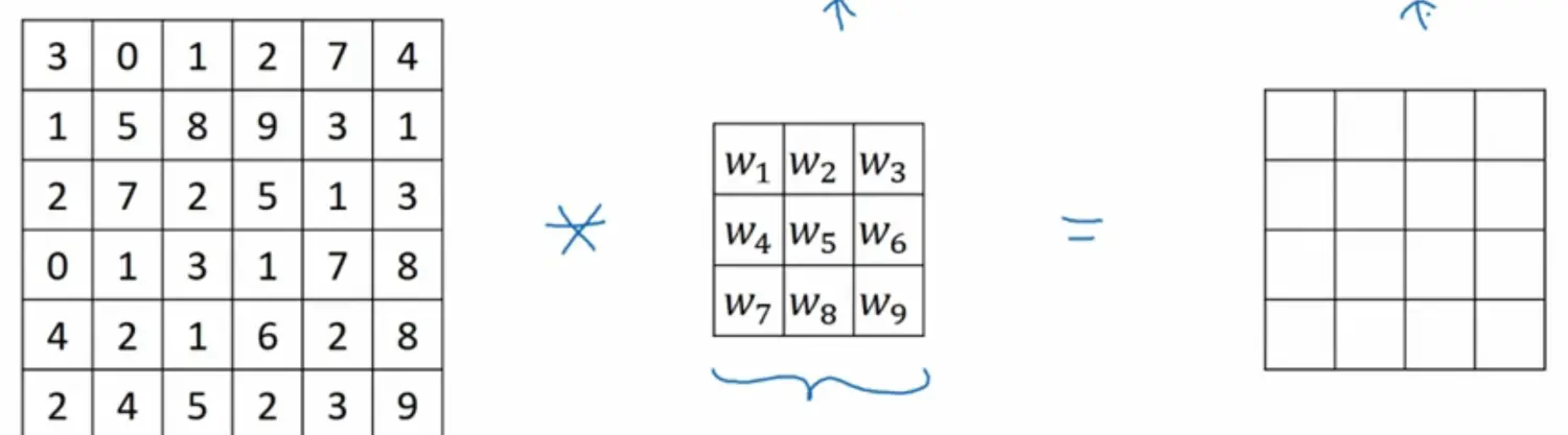可以看到,我们训练的是过滤器的权重矩阵W,无论原图变得再大,我们需要训练的矩阵W大小是不变的。