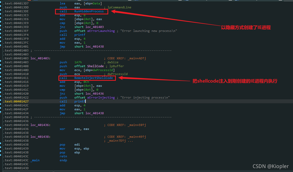 接着就以隐藏方式开启了IE浏览器,接着把shellcode注入到IE浏览器内部