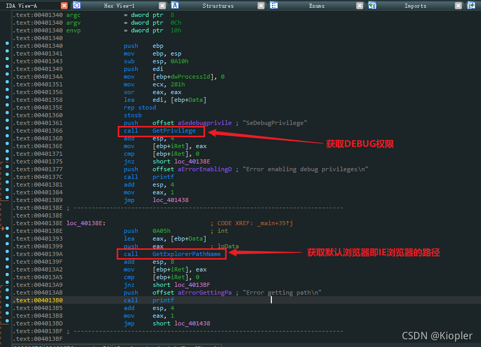 现在把程序拖入IDA中,一上来就获取了debug权限,后来就获取了IE的路径