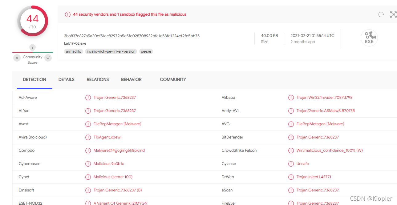 把样本拖入VT内分析:可以看到爆红,查看一下细节, 发现了IE浏览器进程被创建了。查看一下导入函数,发现导入了提权相关API。还有远线程注入以及进程创建相关的API现在把程序拖入IDA中,一上来就获取了debug权限,后来就获取了IE的路径其打开了注册表的HKEY_LOCAL_MACHINE\\http\\shell\\open\\command项, 即IE的路径,这个命令行执行后会打开IE浏览器
