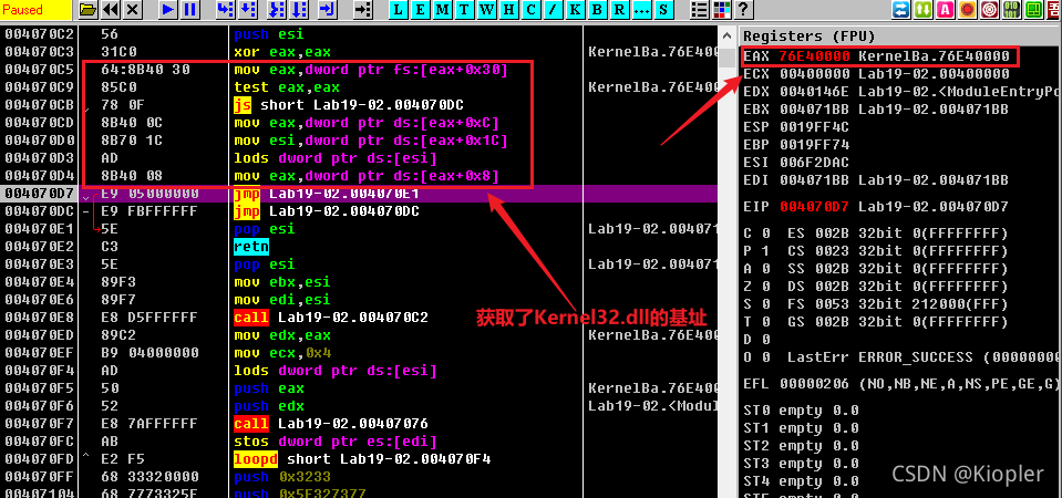 这里解析kernel32.dll的PE结构的导出表,查找对应函数名的hash值: