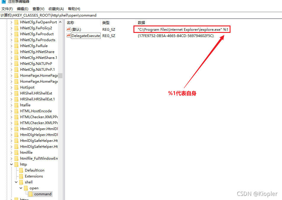 其打开了注册表的HKEY_LOCAL_MACHINE\\http\\shell\\open\\command项, 即IE的路径,这个命令行执行后会打开IE浏览器