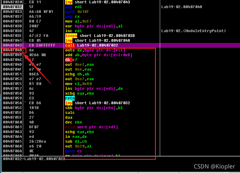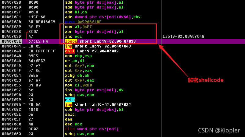 解密循环结束后,同样的位置代码已经改变,解密完成,现在开始分析shellcode