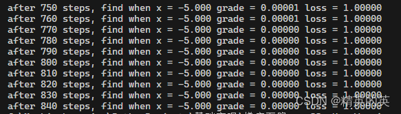 print("after {} steps, find when x = {:.3f} grade = {:.5f} loss = {:.5f}".format(steps, int(x_pos), grade, loss))