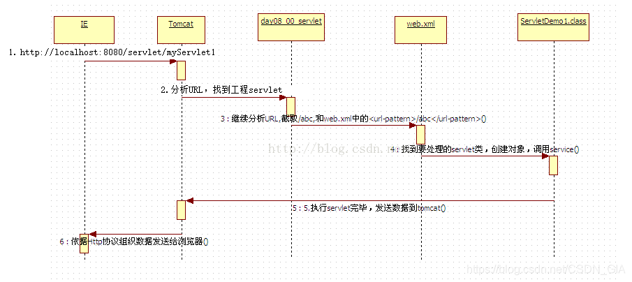 请求发送到服务端,由tomcat接收该请求,调用引擎来分析该请求的url,找到资源地址,哪个工程,资源地址是哪个,拿到资源地址和工程里的web.xml文件里面的所有的url-pattern来对比,对比上了,就找到了这个servlet,接下来调用无参构造器创建servlet对象,创建好之后,默认调用带参的init()方法,再调用service方法处理请求,处理完请求,再向客户端发送数据,采用response响应对象,将数据发送给服务器(不是直接到浏览器),Tomcat再按照http的格式要求,把这些数据组合成一个键值对的方式,发送回客户端,客户端浏览器接收到响应正文的时候,由于响应正文都是字符串,会按照响应头里的各个信息,来依次解析响应正文,再显示在浏览器中。