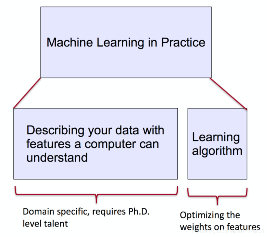 如上图所示,传统的机器学习算法在应用的过程中,大部分的工作是人们研究如何描述特征,同时总结出重要特征。小部分的工作是计算机进行优化。