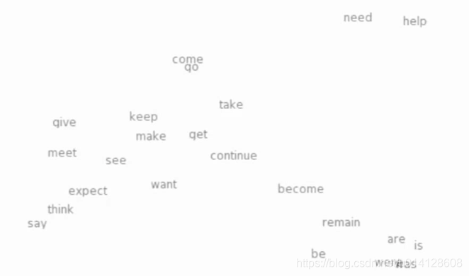 这就意味着,我们将单词放在高维向量空间中,构成了语义空间。具有相似含义的词汇将在矢量空间中形成聚集块。如下图所示,'come' 与 ‘go’ 很相似。